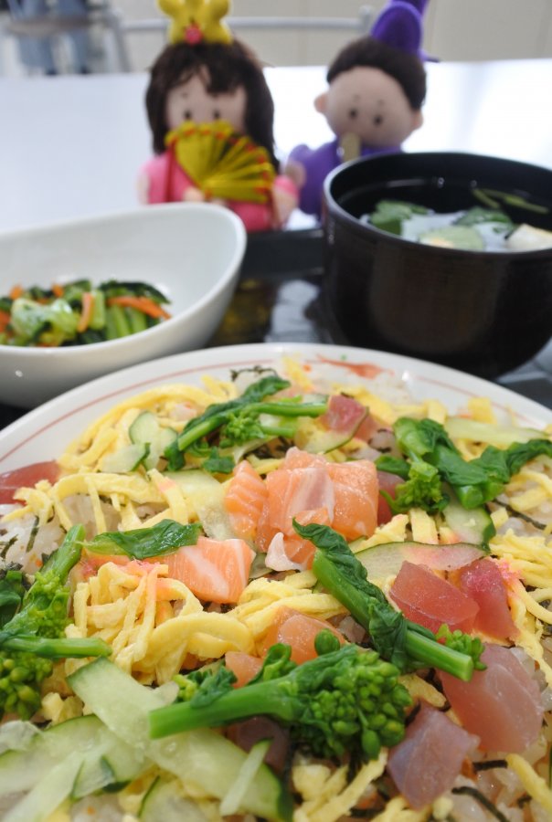 巻き寿司、大豆とじゃこの飴がらめ、白菜おかか和え、うどん、果物